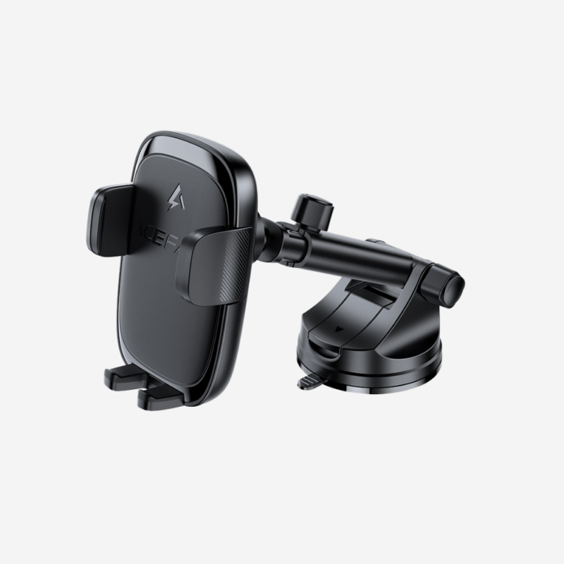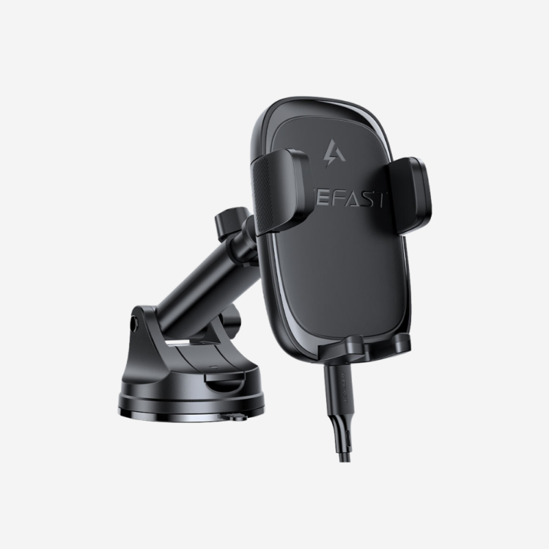 In-car wireless charging holder. 5W / 7.5W / 10W / 15W output. Mechanical clamp. Release button to unlock clamps. Telescopic