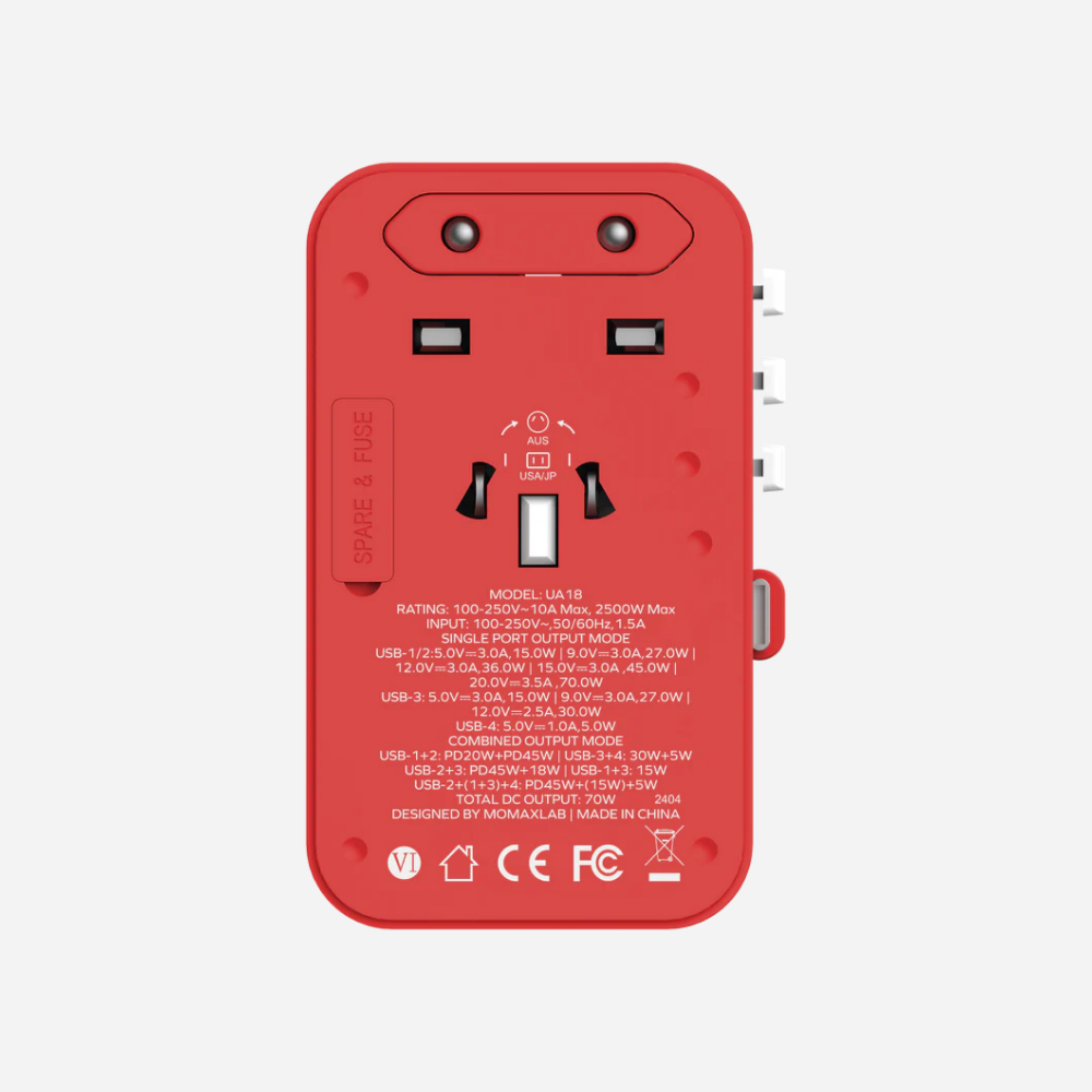 - Universal travel charger with built-in JP/US, AU, EU, UK sockets